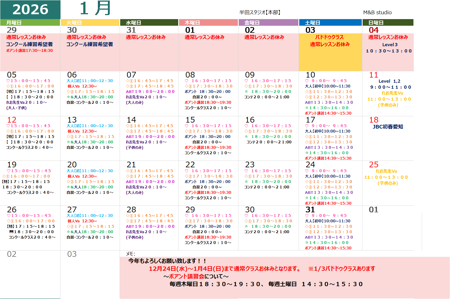 1月のスケジュールをお知らせします